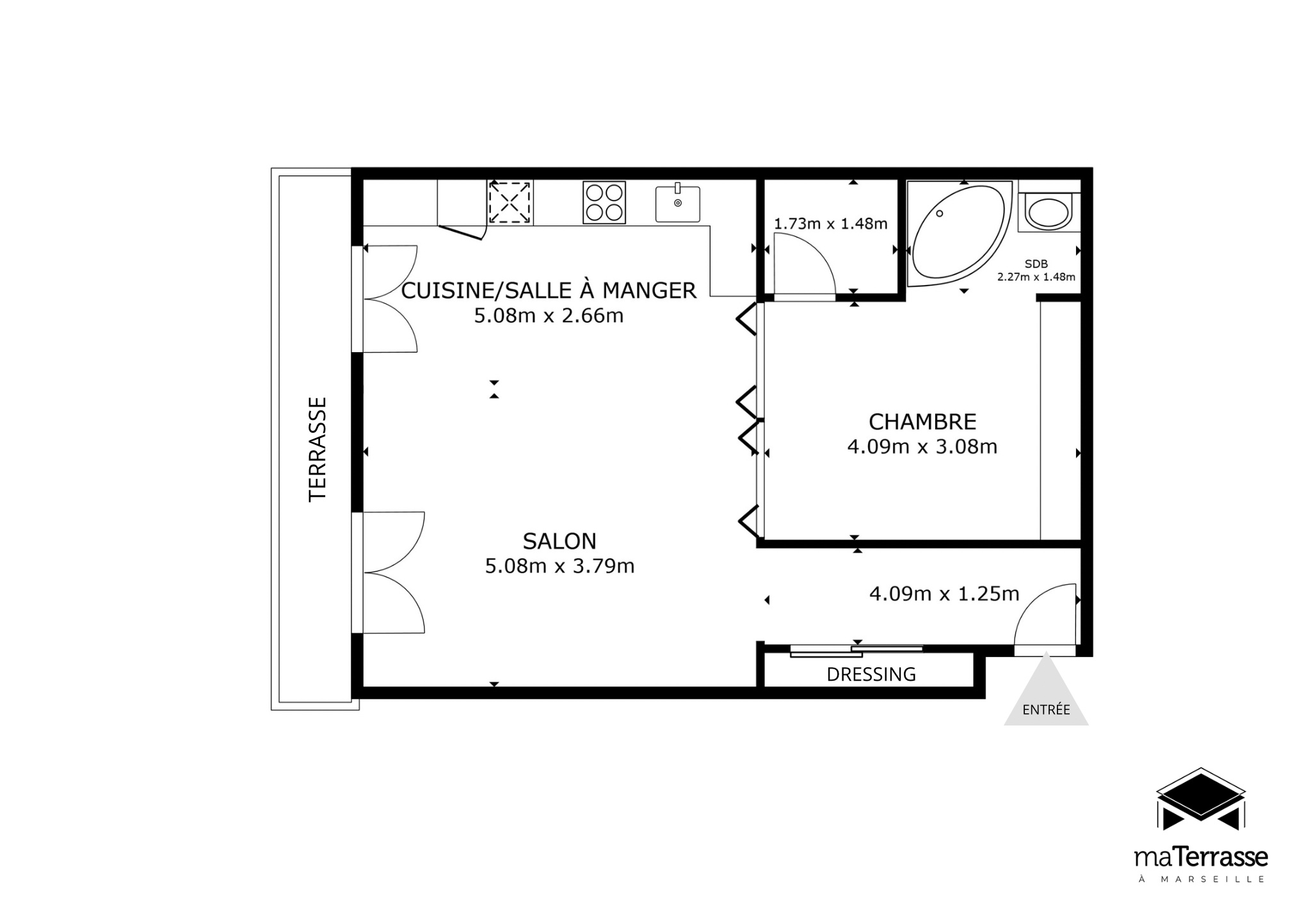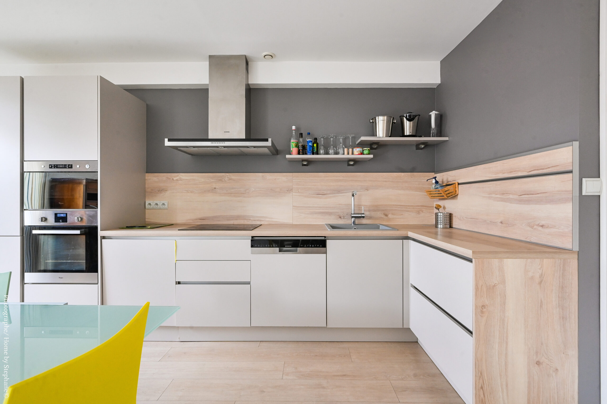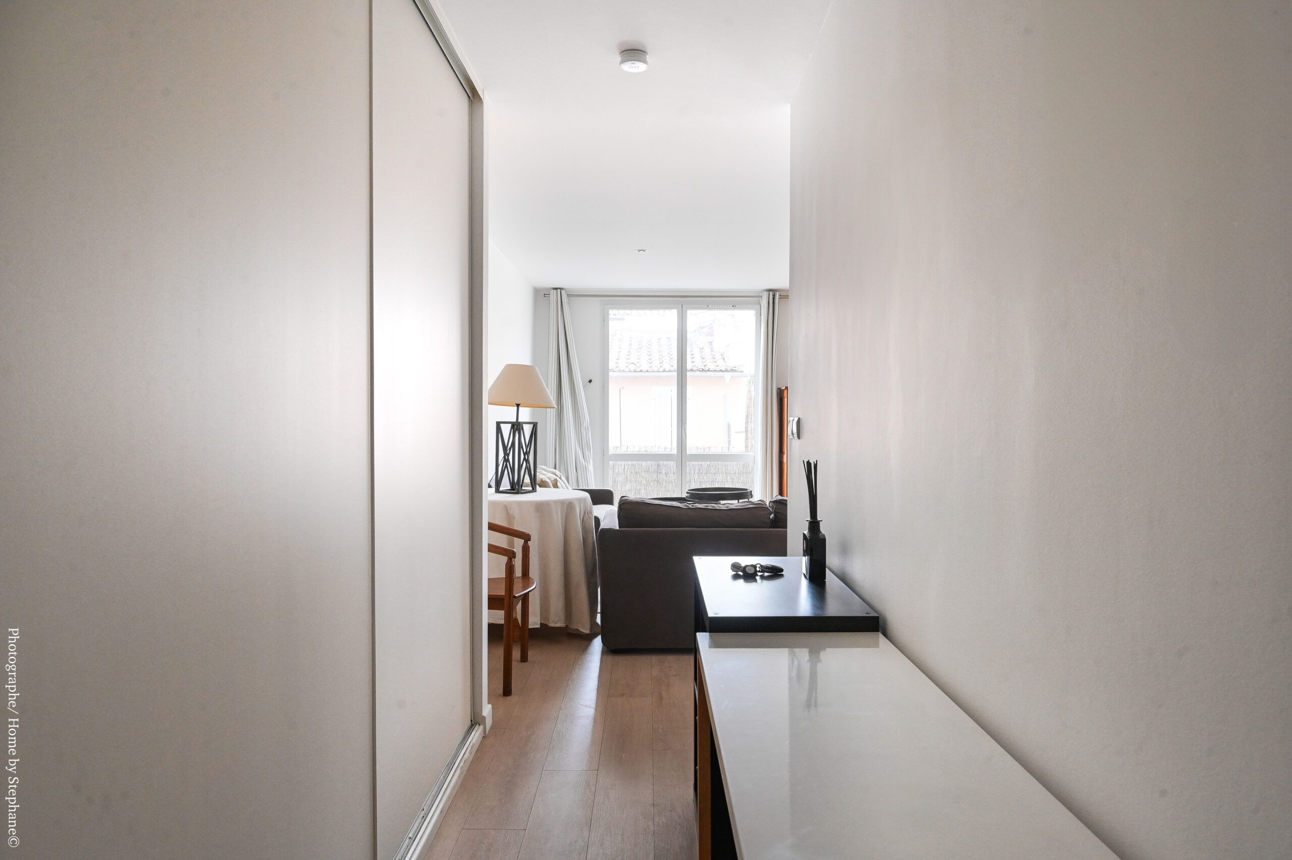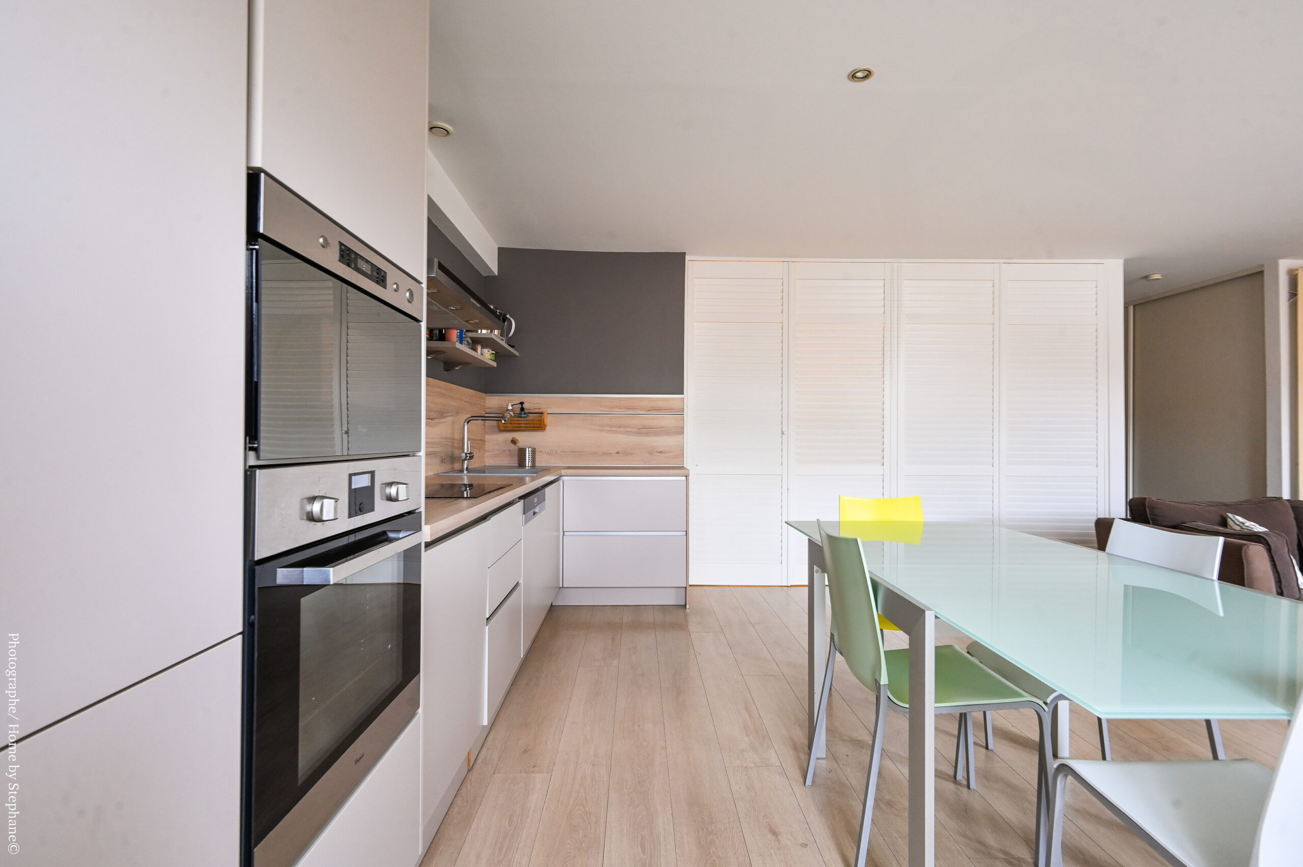L’entrée dessert une grande pièce de vie ouverte sur le balcon et agrémentée d’une belle cuisine équipée.