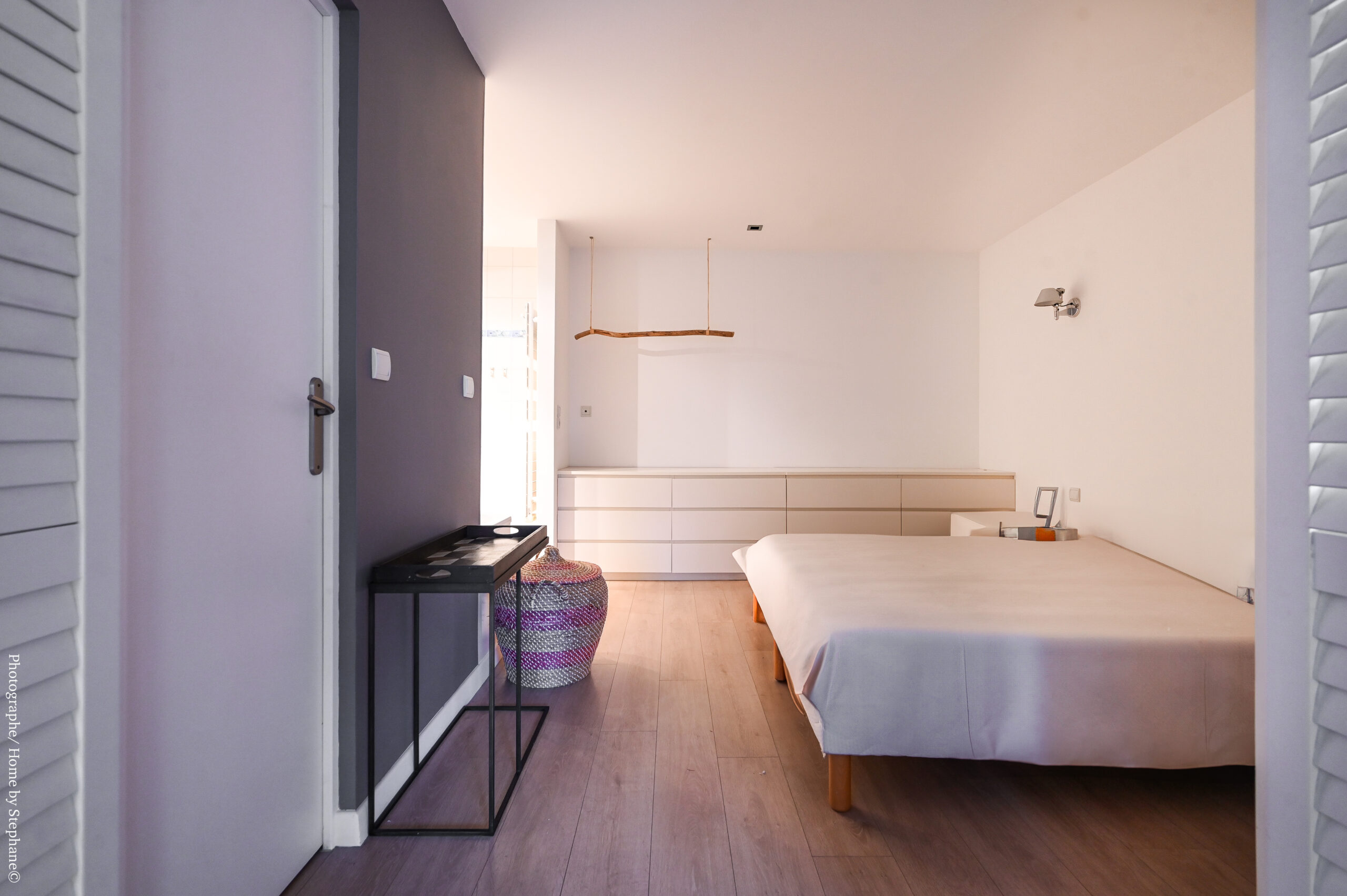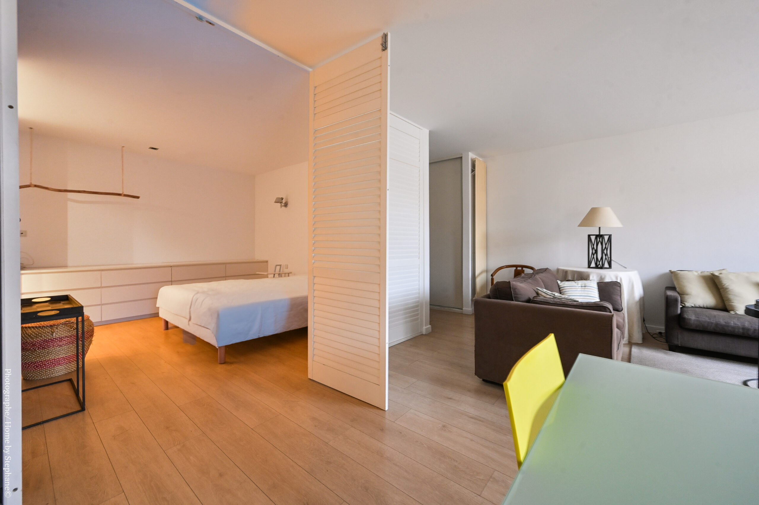 La partie nuit se compose d’une chambre, d’une grande salle de bains et de toilettes séparées. La chambre peut s’ouvrir en partie sur le salon ou être totalement isolée via un système ingénieux et parfaitement occultant de cloison.