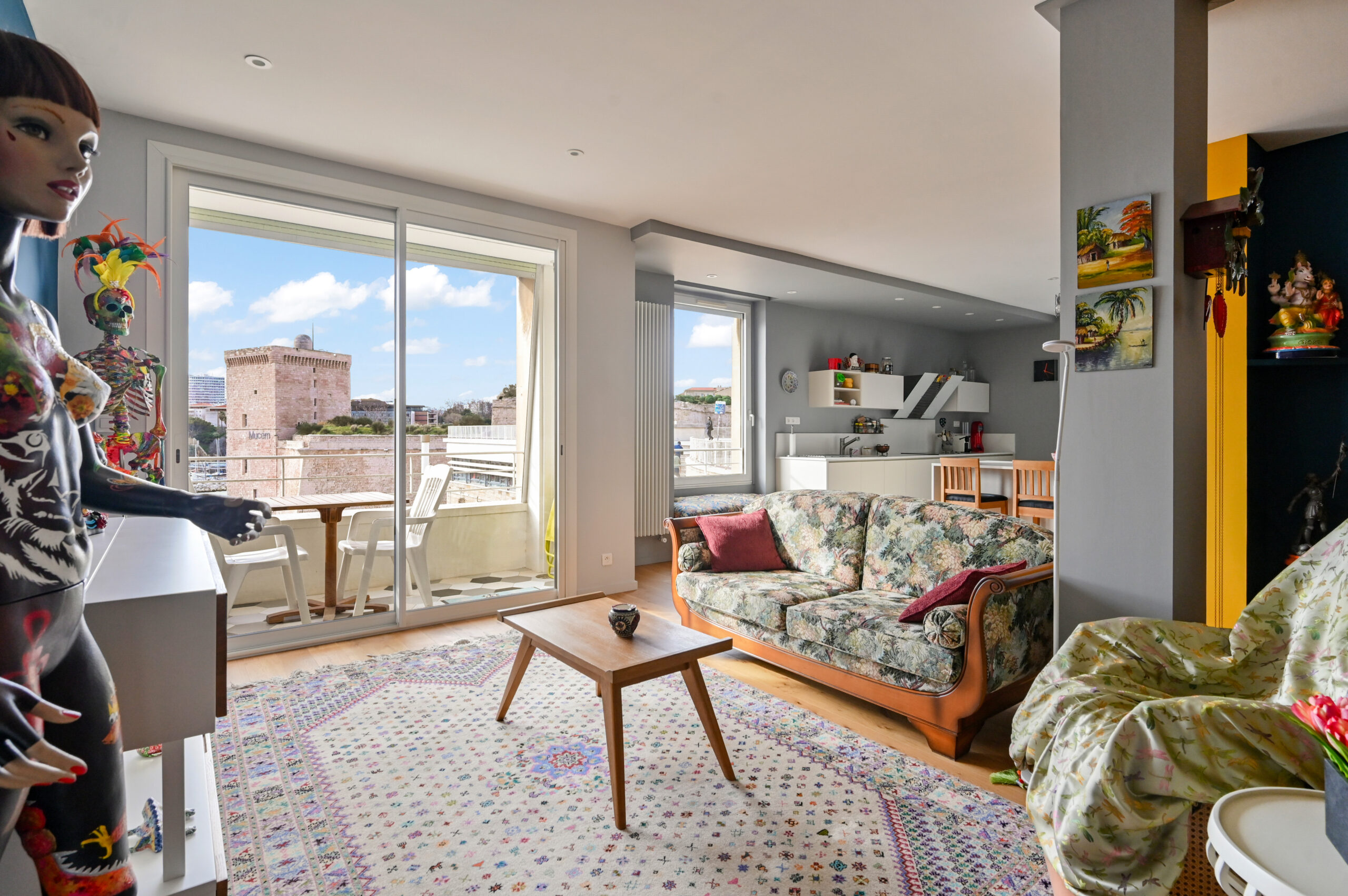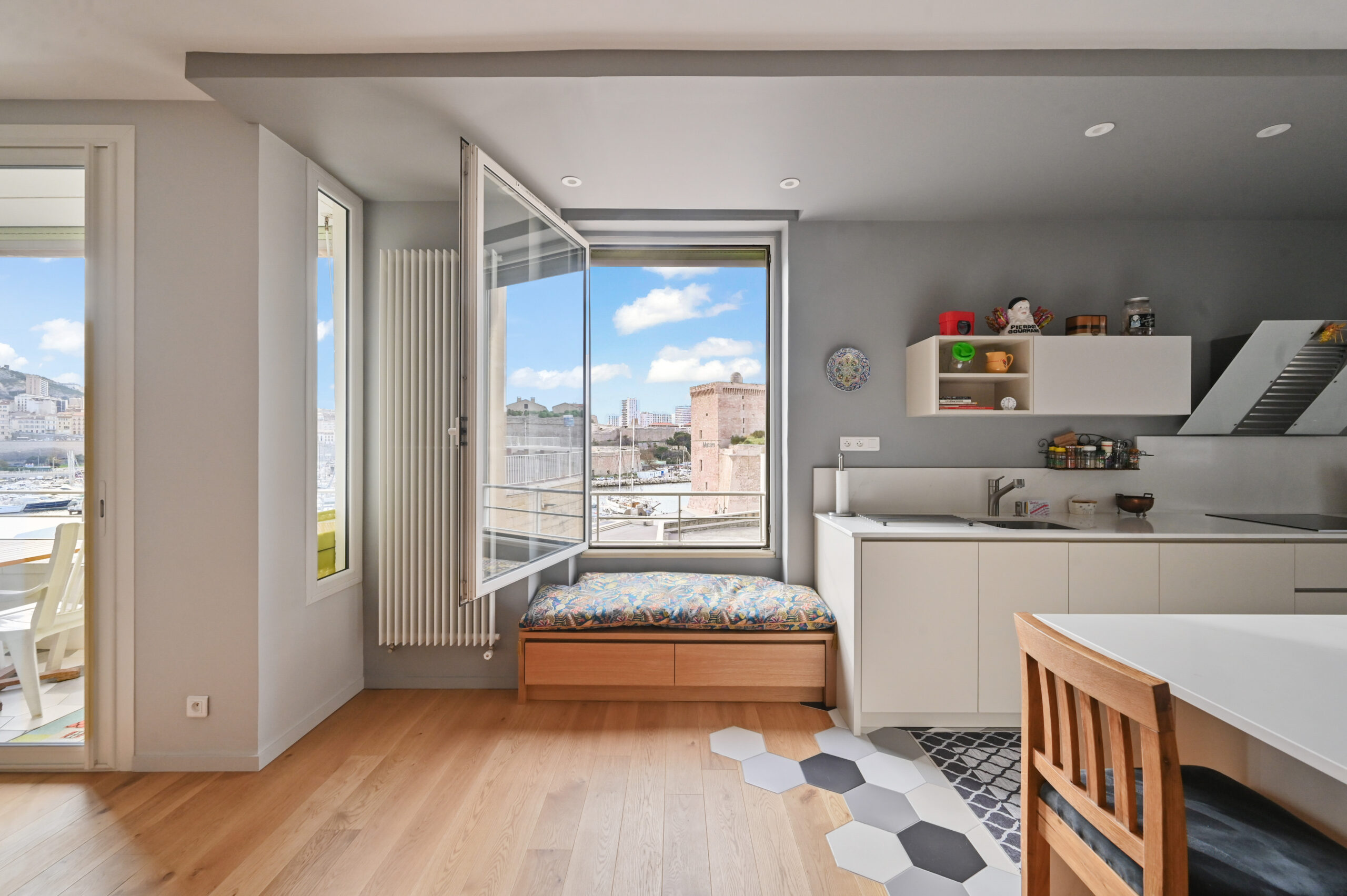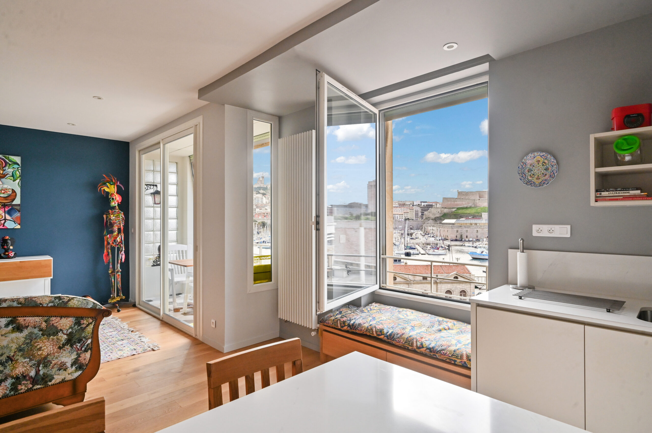 Dès l’entrée, vous serez envouté.es par la vue imprenable sur le Vieux-Port : la Citadelle, le Fort Saint-Jean, Notre-Dame de la Garde, le ballet des bateaux…